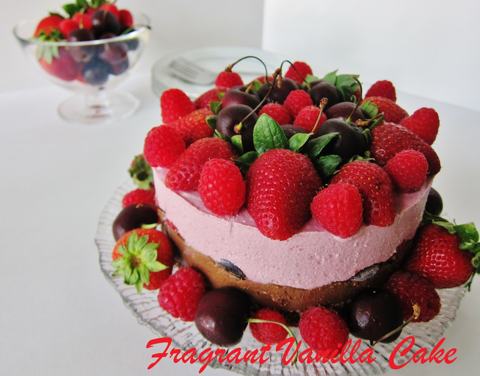 Once set, top the cake with fresh cherries, and berries and serve!