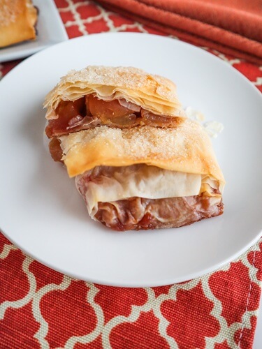 They are actually pretty easy to make.  I made the filling first, the day before actually so it could cool.  It is pretty simple like a pie filling just cooked in a pan.  I added some maple and vanilla flavors to make it extra delicious!  For the filo dough, you want to make sure you thaw it out overnight so it is easier to work with the next day and doesn't break as much.  Then while you are working with it I recommend putting plastic wrap over the pieces you aren't working with so it doesn't dry out.